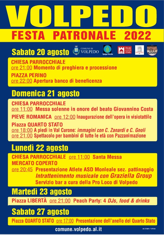 Come ogni anno, Volpedo celebra il suo patrono beato Giovannino Costa la penultima domenica di agosto. Gli eventi hanno inizio sabato 20 alle ore 21 con un momento di preghiera nella chiesa parrocchiale, cui seguono la tradizionale processione e l'apertura del banco di beneficenza in piazza Perino.