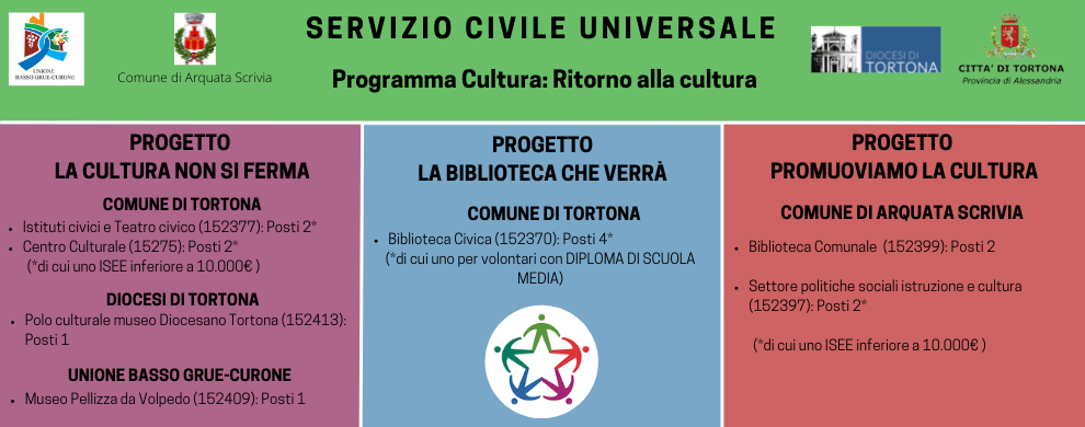E' pubblicato il bando per il progetto di servizio civile universale "La cultura non si ferma" per giovani tra i 18 e i 28 anni presso diversi enti del Tortonese afferenti all'Unione basso Grue-Curone, compreso un posto ai Musei Pellizza a Volpedo.