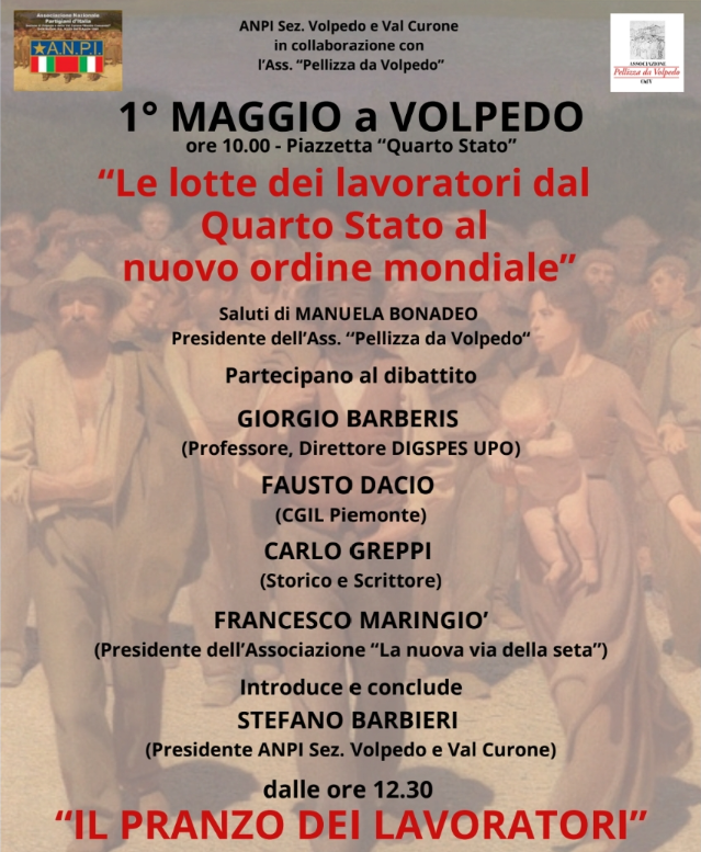 In piazzetta Quarto Stato incontro su Le lotte dei lavoratori dal Quarto Stato al nuovo ordine mondiale; a seguire il Pranzo dei lavoratori.