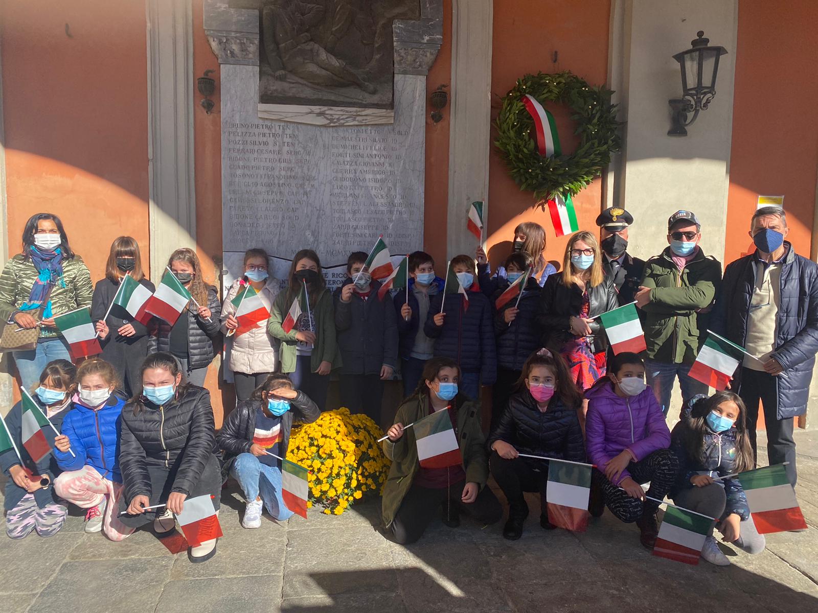 Davanti alle lapidi che ricordano i caduti delle due guerre, recentemente restaurate e per l'occasione adornate di fiori, i bambini hanno incontrato il sindaco Elisa Giardini, il vice-sindaco Antonio Lugano, il consigliere Silvano Nobile e il maresciallo dei Carabinieri Francesco Barisonzi, e hanno ricevuto in omaggio una bandiera tricolore per ciascuno.