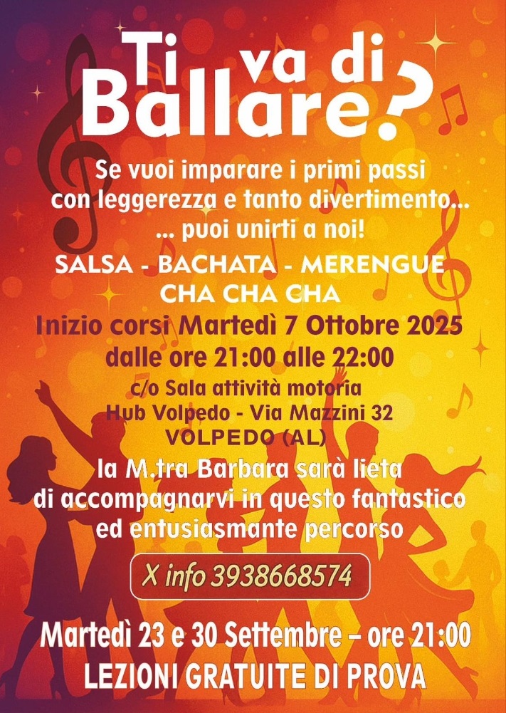 Inizio corsi di salsa, bachata, merengue, cha cha cha nella sala attività motoria di Hub Volpedo, via Mazzini 32.